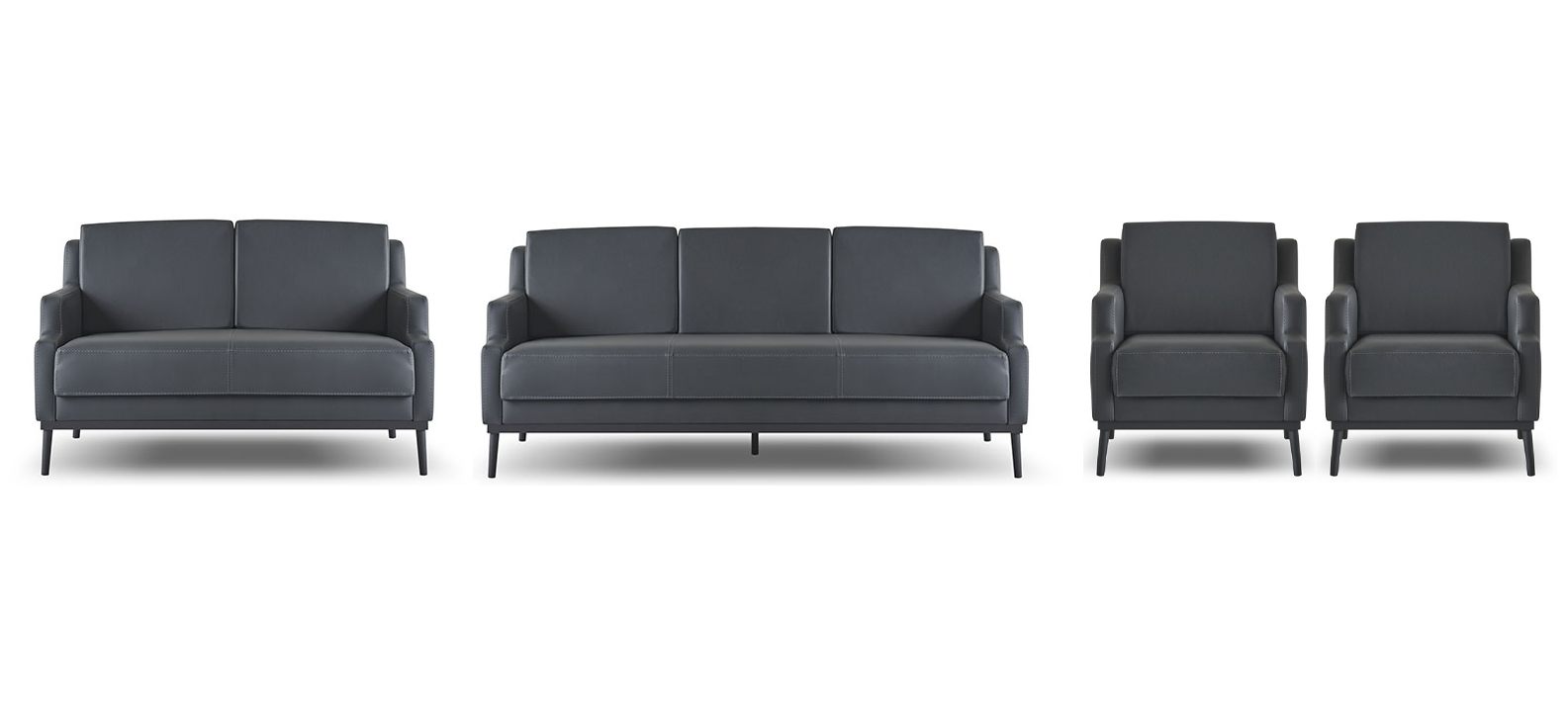 Das dunkelgraue 3-Sitzer Sofa, das 2-Sitzer Sofa und die beiden Sessel bilden