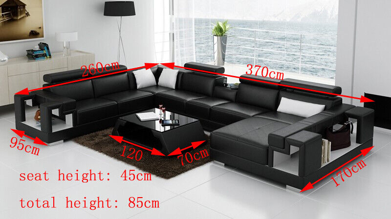 Entspannen Sie in Stil und Komfort mit unserer Wohnlandschaft Eckcouch Eckgarnitur Sofa Polster Eckcouch Couch! Diese einladende U-förmige Couch bietet großzügigen Platz für die ganze Familie und Freunde. Hergestellt aus Premium Lederfaserstoff (70% Leder / 30% Polyester) und mit einer eleganten Farbauswahl, darunter Zyan, Kirschrot, und Schwarz, ist diese Eckcouch nicht nur stilvoll, sondern auch langlebig. Die Maße von ca. 260 x 370 x 170 cm oder 170 x 370 x 260 cm bieten viel Platz zum Entspannen, während die Sitzhöhe von ca. 45 cm und Sitztiefe von ca. 59 cm optimalen Komfort bieten. Optional sind verschiedene Materialgruppen verfügbar, darunter Premium Echtleder und Premium Textilstoff, um Ihren persönlichen Stil zu unterstreichen. Das Innengestell aus echtem Holz sorgt für Stabilität und Langlebigkeit. Bringen Sie Luxus in Ihr Zuhause mit dieser exquisiten Wohnlandschaft! Wählen Sie Ihre Lieblingsfarbe und bestellen Sie noch heute!