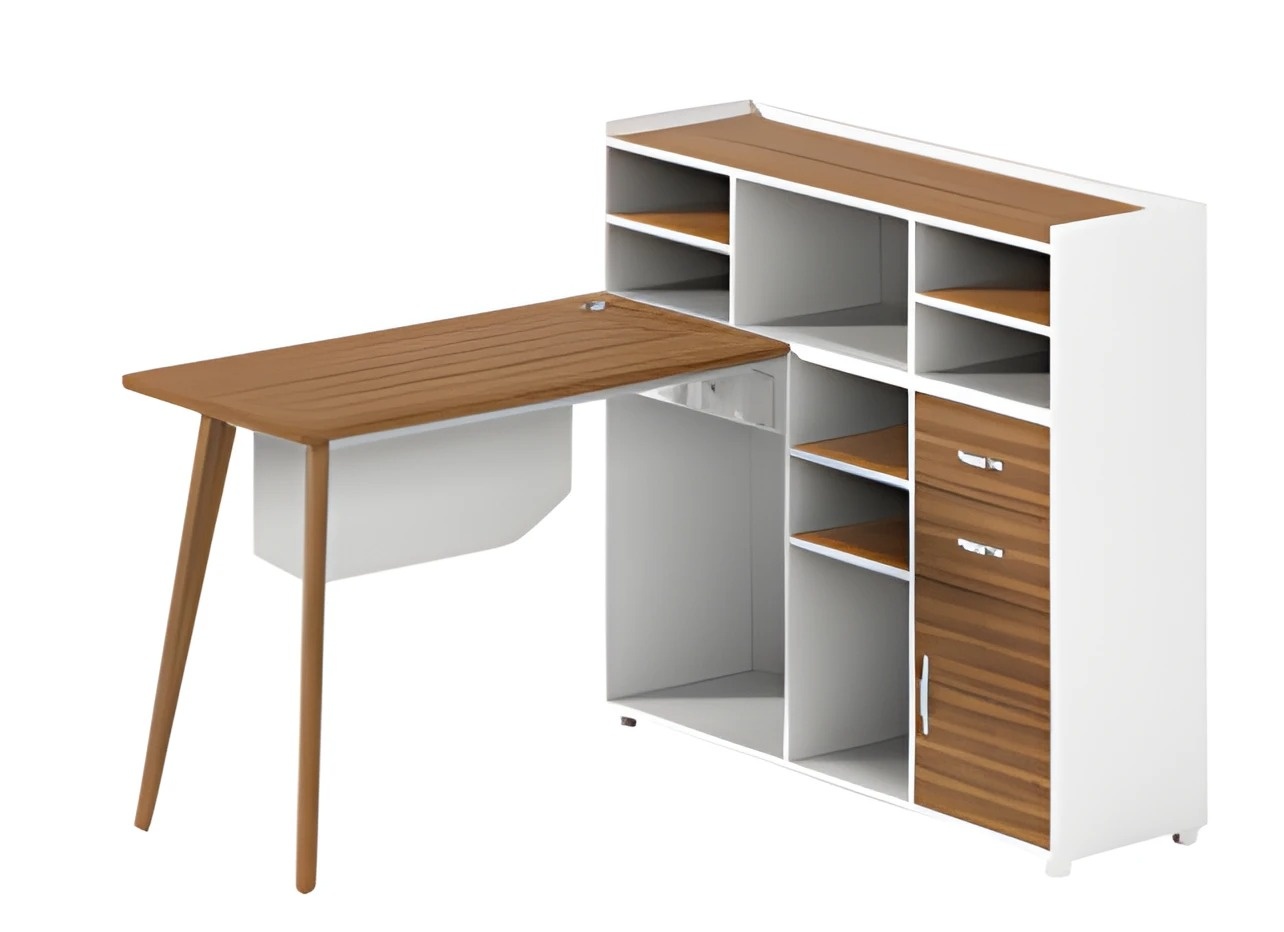 Λευκό ξύλινο τραπέζι με αποθηκευτικό χώρο, ανοιχτές θήκες και κομψά πόδια