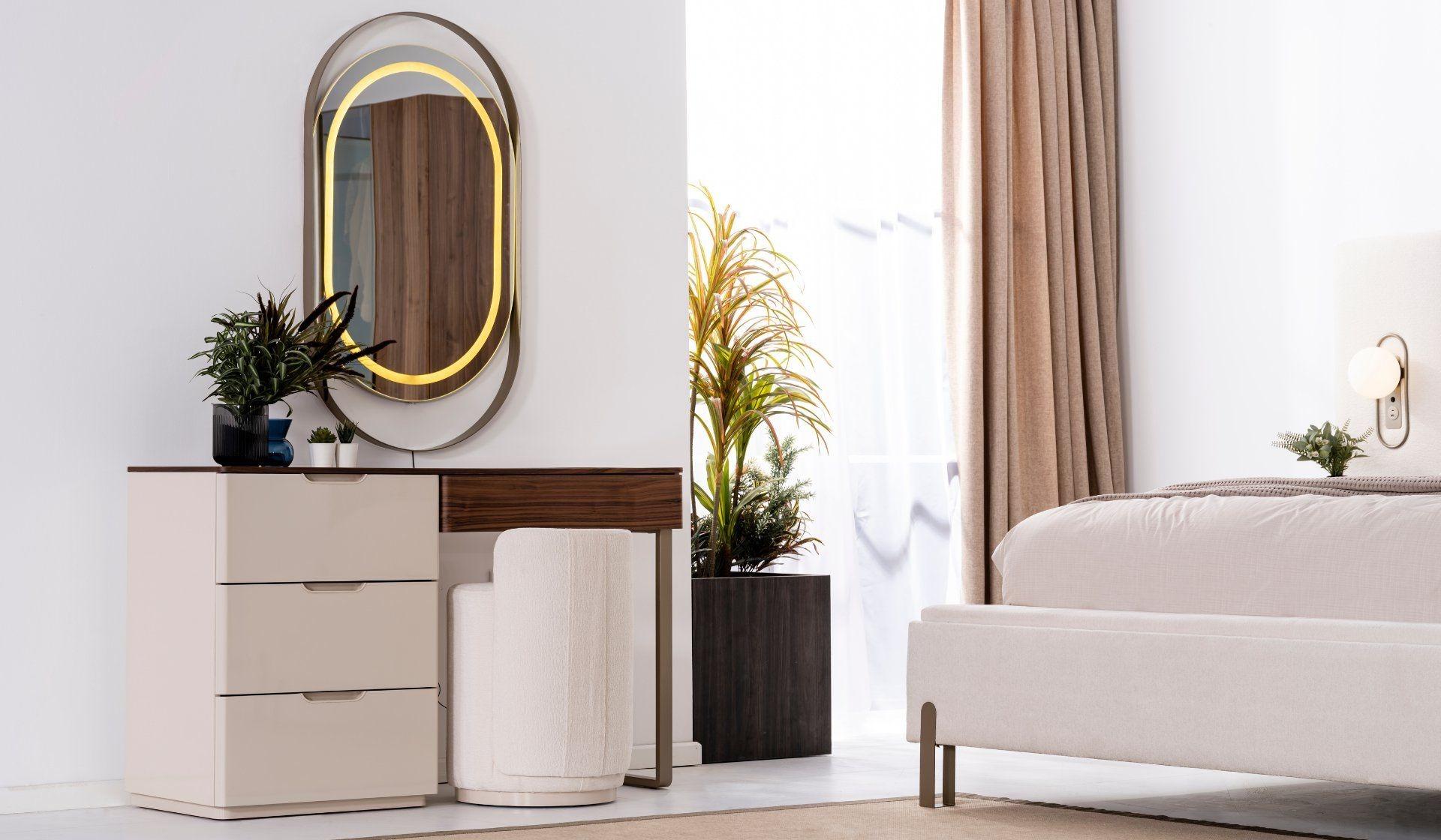Der Schminktisch mit passendem Spiegel bietet einen stilvollen Ort für Ihre morgendliche Routine, während die beiden Nachttische praktischen Stauraum für persönliche Gegenstände bieten. Der Hocker rundet das Set ab und kann als zusätzliche Sitzgelegenheit oder Ablage genutzt werden. Mit diesem Schlafzimmer Set können Sie Ihr Schlafzimmer in eine stilvolle Oase der Entspannung verwandeln und jedem Raum ein Hauch von Luxus verleihen. EAN: 4067282588608