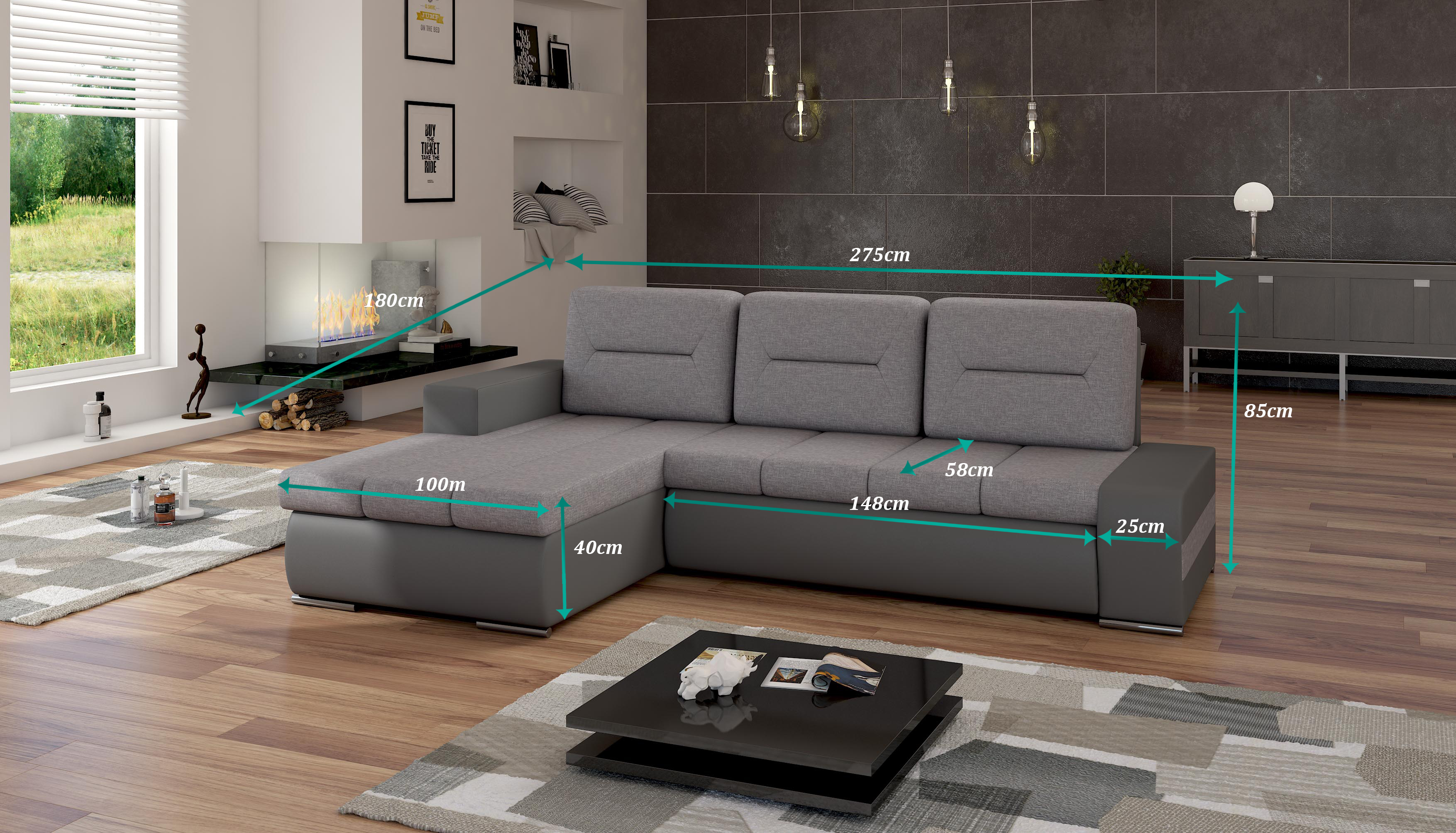 Entspannen Sie in Stil und Komfort mit dem Design Ecksofa Ottavio Bettfunktion! Dieses moderne Ecksofa in L-Form bietet nicht nur eine gemütliche Sitzgelegenheit, sondern kann auch in ein komfortables Bett umgewandelt werden. Mit Maßen von ca. 180 x 275 cm oder 275 x 180 cm passt dieses Sofa perfekt in Ihr Wohnzimmer und lädt zum Entspannen ein. Das Ecksofa ist in einer Vielzahl von Farben erhältlich, darunter Zyan, Amethyst, Flieder, Veilchenblau und viele mehr. Wählen Sie aus verschiedenen Materialoptionen wie Stoff oder Kunstleder in verschiedenen Preisklassen, um Ihren persönlichen Stil widerzuspiegeln. Das Innengestell aus echtem Holz sorgt zudem für Stabilität und Langlebigkeit. Erleben Sie Luxus und Qualität mit dem Design Ecksofa Ottavio Bettfunktion - bestellen Sie jetzt und verwandeln Sie Ihr Wohnzimmer in eine stilvolle Oase!