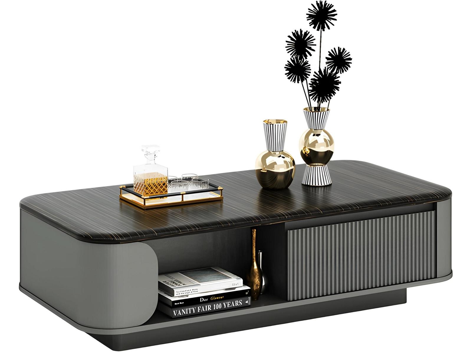 Μοντέρνο τραπέζι σαλονιού με κομψό σχέδιο και μαύρη επιφάνεια καθώς και ανοιχτές ράφια | xlhome.gr