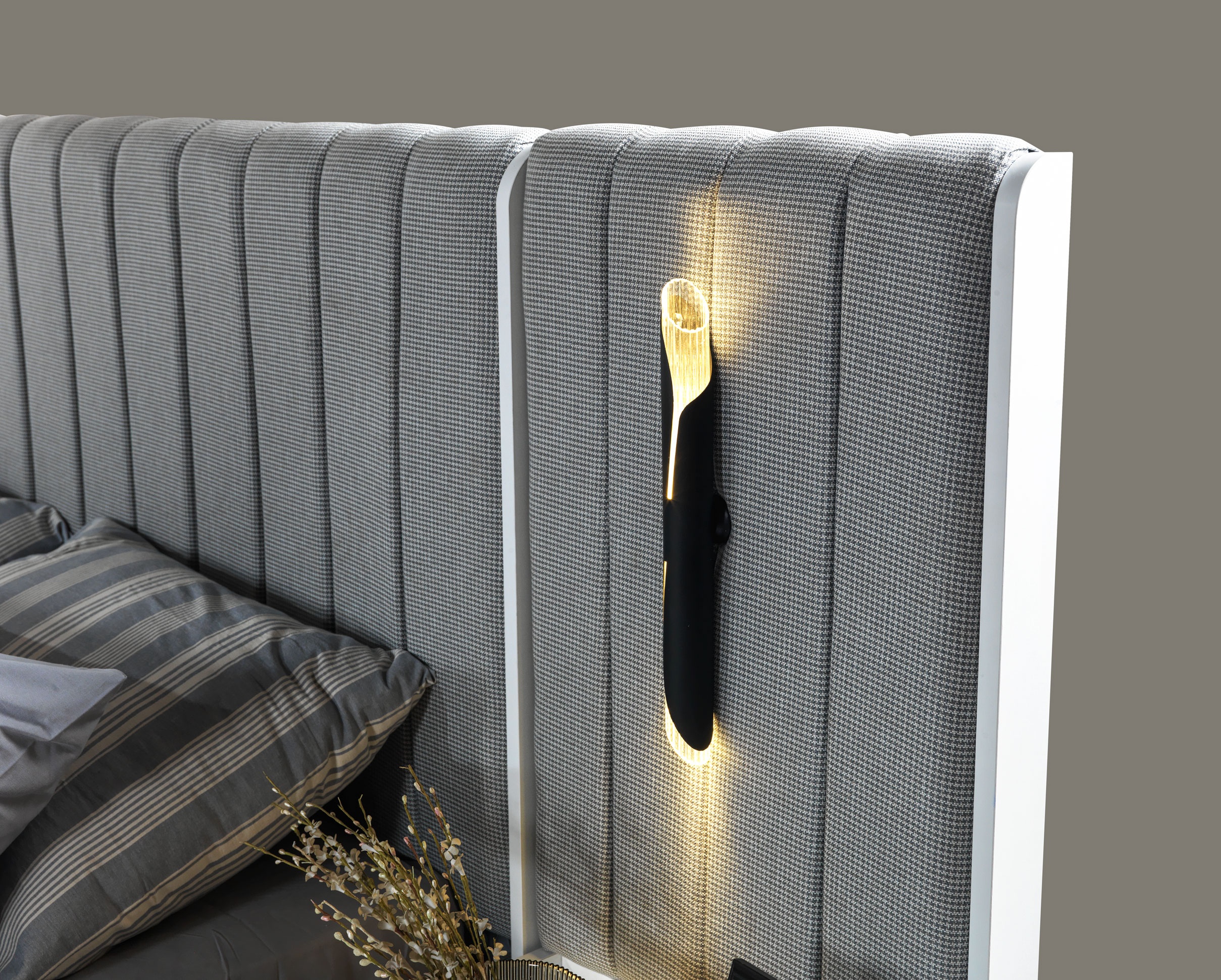 Η σύνθεση επίπλων υπνοδωματίου με κρεβάτι και δύο μοντέρνα κομοδίνα εκπροσωπεί την απόλυτη εκλεπτυσμένη αισθητική. Το γκρι χρώμα, σε συνδυασμό με την αψεγάδιαστη κατασκευή, προσφέρει μια απαλή, αλλά εντυπωσιακή ατμόσφαιρα. Το κρεβάτι, με τις καθαρές γραμμές και την άριστη ποιότητα υλικών, υπόσχεται άνεση και στήριξη που αναβαθμίζει την εμπειρία του ύπνου. Τα κομοδίνα, σχεδιασμένα με σύγχρονη γραφή, προσθέτουν λειτουργικότητα χωρίς να θυσιάζουν την κομψότητα. Αυτή η σύνθεση είναι η ιδανική επιλογή για εκείνους που επιθυμούν να απολαύσουν μια αποκλειστική και πολυτελή ζωή, αναδεικνύοντας την προσωπικότητα και το γούστο τους.