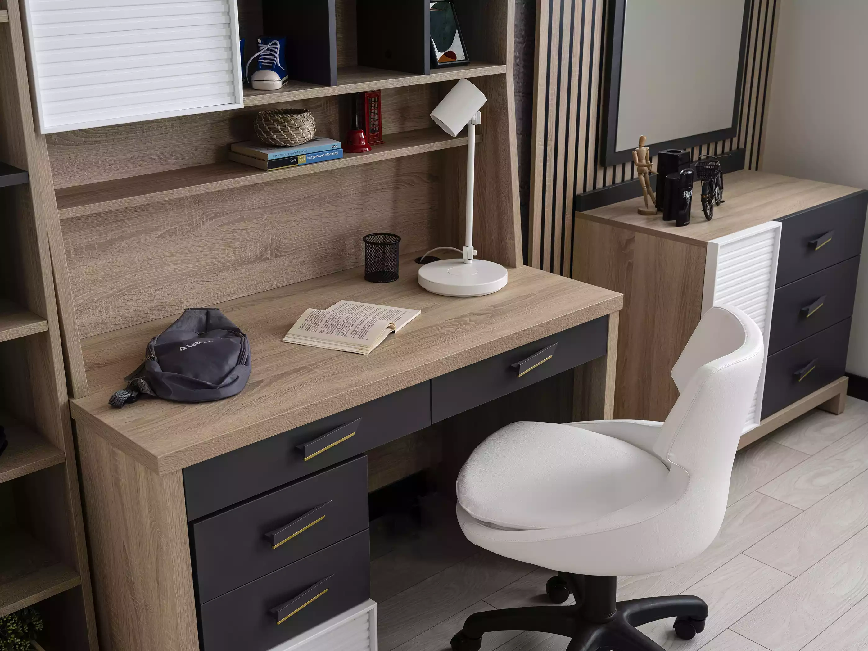 Η Σύνθεση επίπλων για παιδιά, με κρεβάτι σε γκρι ξύλο, συνδυάζει την κομψότητα και την πρακτικότητα με αριστοτεχνική εκτέλεση. Κάθε ένα από τα 8 κομμάτια έχει σχεδιαστεί με προσοχή στη λεπτομέρεια, προσφέροντας λειτουργικότητα και στυλ. Η γκρι απόχρωση του ξύλου προσδίδει μία σύγχρονη αίσθηση, ιδανική για την ανάπτυξη ενός πραγματικά αποκλειστικού περιβάλλοντος. Με 20 χρόνια εμπειρίας στον τομέα της πολυτελούς επίπλωσης, αυτή η σύνθεση αποπνέει ποιότητα και διαχρονική αισθητική, κάνοντάς την την ιδανική επιλογή για γονείς που επιθυμούν να επενδύσουν σε ένα χώρο που αντικατοπτρίζει έναν εκλεπτυσμένο τρόπο ζωής.